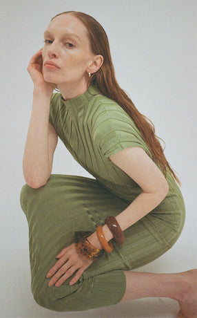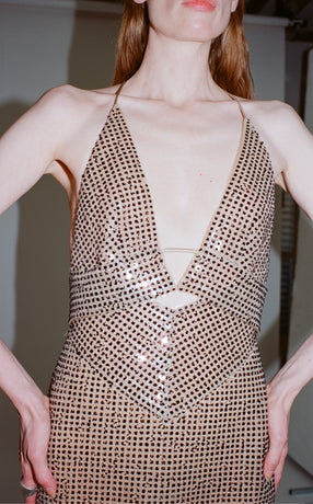 The Iris Dress embodies GALVAN's forays into sportswear in a longline, highneck silhouette, elevated to occasionwear in a sheer jersey fabrication with tubular detailing at the front, back and side seams and available in classic Black or rich Brandy.